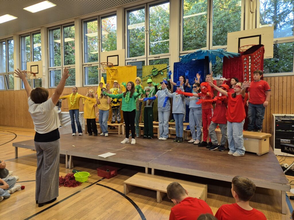Im Anschluss daran erklärte die Gesamtleiterin Frau Vix kurz, welche Botschaft in dem Bühnenstück steckt: Wenn alle denken, nur sie seien wichtig und richtig, dann klappt das mit dem Miteinander nicht so richtig. Das gilt für Farben und für Menschen! Zu Beginn des Stückes waren die Farben noch streng getrennt und die Darsteller*innen hoben die Vorteile und Stärken ihrer Fraktion hervor. Die Farbe rot untermalte dies z.B. mit einem flotten Rap. Doch dann kamen Zweifel an der Sinnhaftigkeit dieser Trennung auf und so nach und nach wurde aus dem Vierfarbenland ein kunterbuntes Treiben.